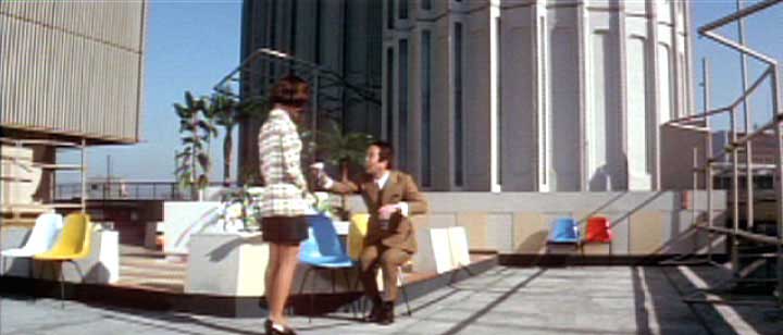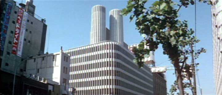 開始より0:08(東京都千代田区有楽町・東宝ツインタワービル) 三矢物産に勤務する田沼雄一(加山雄三)は取引のため、大学時代の友人である 青大将こと石山新治郎(田中邦衛)が専務を勤める石山エンタープライズを訪れる。 石山エンタープライズの社屋として使われたのは日比谷にある東宝ツインタワービルだ。 |