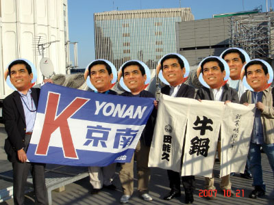 この屋上には無断で上がったわけではない。 最初、2007年8月に訪れた時、ビルの警備を担当している方に事情を話して屋上に上がらせてもらうことを試みたのだが、事前の許可が必要とのことで、その時は断念。その後メタBOの若大将さんが東宝ツインタワービルと交渉、東宝ツインタワービルのご好意により、目出たく今回の撮影になった。 左の写真は撮影時に参加された「京南大学OB会」の面々。 |