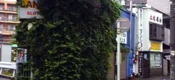 作品の場面では森繁の車の先の方に不動産店の看板が見える。巡礼写真では見にくいが、同じ位置に不動産店は現在でも存在する。 作品ではその手前に暖簾がかかった飲食店のような木造平屋の建物も見える。この建物は現在は盛大に蔦がからまった状態になっているが当時のまま残っているようだ。 (撮影・モンパパさん 2010) |