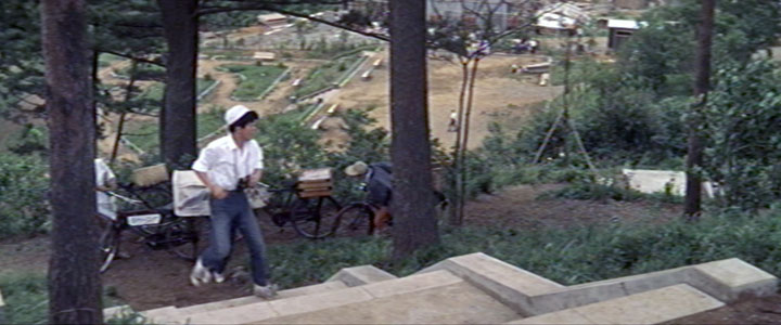 「オレねえ、昨日、桃子のとこへ洗濯物とりに行ったんだよ。そしたら根掘り葉掘りおまえのこと聞いてたぞ」 「そんなこと・・」 「そんなことないよって、まんざらでもなさそうじゃないか」 「そんなことないよ」 建設中の団地を見下ろす小高い丘の上で孫作の息子、一郎(久保賢)(後に日活に移籍して山内賢、久保明の実弟)が昼寝をしている。するとそこへクリーニング店の九作をはじめ商店の小僧らが来て、一郎と「高砂亭」の桃子(黛ひかる)との仲をひやかすシーン。 ここは百合丘第一団地(当時)の南側に位置する「弘法松公園」(こうぼうのまつこうえん)だ。 |
