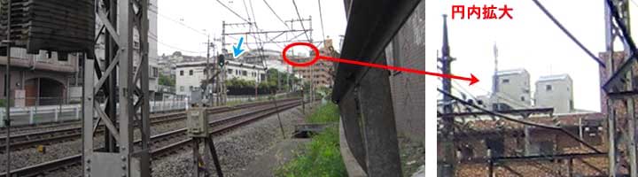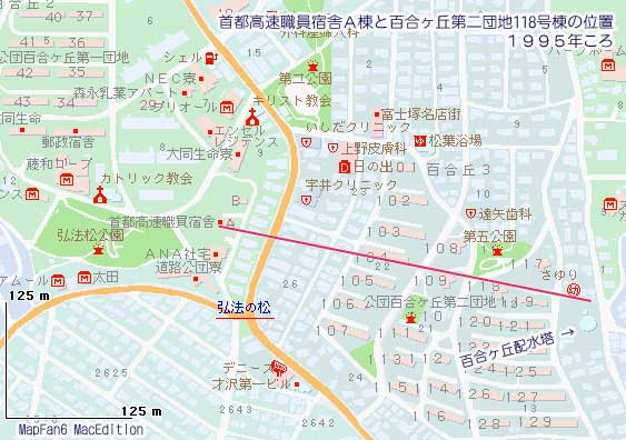 ※注1 そこでSさんがさらに詳しく撮影位置を検証してくださった。 まず上の画像にある「※注1」と書かれた矢印を見ていただきたい。 矢印の左側に写っているのは百合丘第二団地の118号棟(スターハウス)、矢印の右側に遠く写っているのは首都高速職員宿舎A棟とのことだ。撮影位置から見ると、それぞれの右端、左端がちょうど接している。ということはこの二点を結ぶ延長線上に撮影地点があるということになる。そうして当時の地図上でこの位置を割り出してみると、やはり給水塔よりやや北のこの地点ということになる。どうやら給水塔が建っている高台の北側。現在では切り崩された斜面ギリギリくらいのあたりのようだ。(検証: Sさん) しかし給水塔が設置されている水道局の敷地であるこの高台、監視カメラまで設置されて立ち入りが厳重に禁止されているそうだ。だからいずれにしろ現在はこの撮影位置に立つのは難しい状態になってしまっている。 |