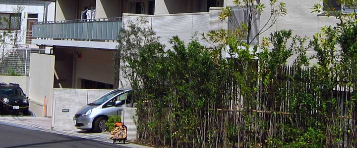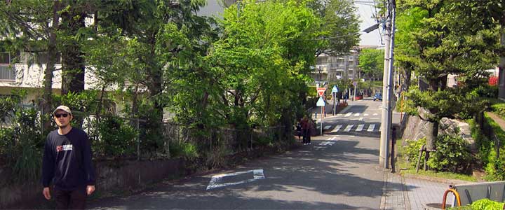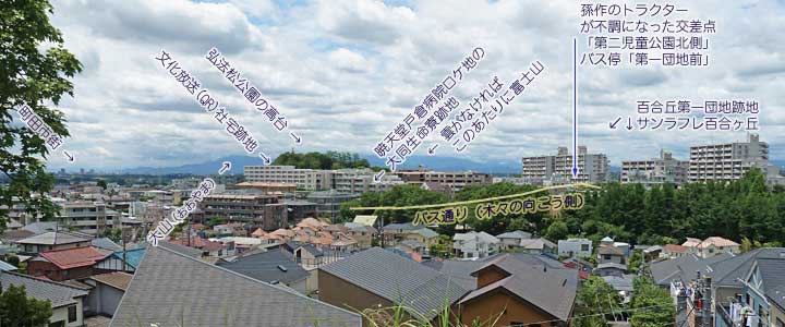 ![]() ![]() (撮影・2012・07・01) ではこの遠くに百合丘団地を一望するシーンはどこから撮影したのだろう。 Sさんの推測によるとこの画面の撮影位置は、小田急線線路を挟んで団地とは反対側の北側、百合ヶ丘駅の西方にある高台からの撮影とのこと。 Sさんはそれを現地に出向かれて確認されていたのだが、私も訪れてみた。 その教えていただいた地点を目指し、線路沿いの県道3号(津久井道)から北に入る。そうとう急な勾配の坂道を登る。坂では無理で階段になっている部分もあり、距離的には県道からそう奥に入るわけではないのだが一気に標高が上がる。 撮影地に到着。現在では住宅が建ち並んでいたり、樹木が繁っていたりで、Sさんが推測された地点からは百合ケ丘団地であった方向を見通すのは難しい状況になっている、やや位置を変えて写真を撮ってみることに。 作品では画面右端に弘法松公園、左端に百合ヶ丘第一団地1号棟がギリギリ入って2、3号棟・・・と続いている。 現在の巡礼写真でも右端に弘法松公園、左端に現在のサンラフレ百合ヶ丘4、1、6号棟などが見える。これら新旧団地の棟の位置はそれほど違う場所ではない。百合ヶ丘駅からは一番近い一角だ。 |