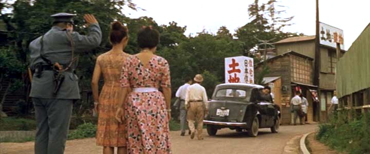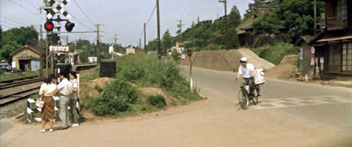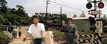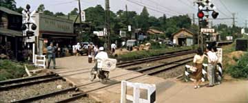 | 九作が踏切を渡ると、カメラは線路の反対側に切りかわる。警報機が鳴っているのに線路を横断してしまったので呼び止める巡査(千葉信男)。 |
