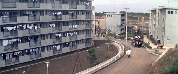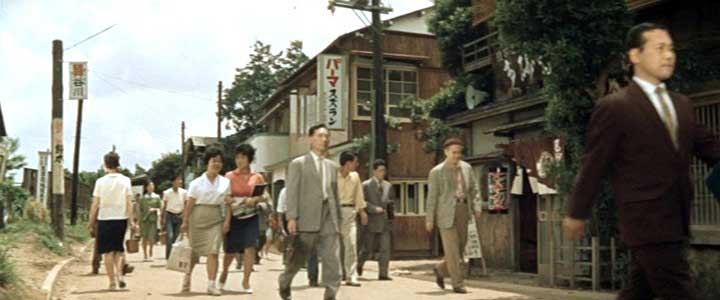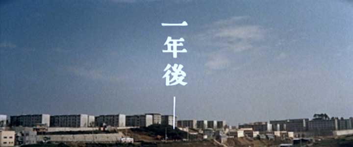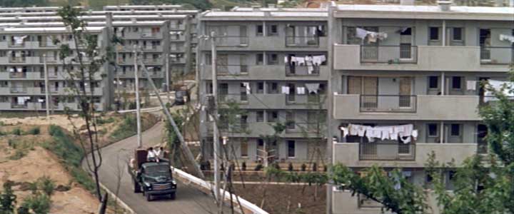 開始より1:24(神奈川県川崎市麻生区高石(カメラ位置)) 新しい団地ができたために一騒動あった町であったが、うまいこと収まることで物語は終わる。 一年後の百合丘は団地の建設工事が終わり、計画中だった新駅「百合ケ丘駅」も、前の特急通過シーンで示されたように、すでに出来上がり開業している。 一年前のシーン、たとえば弘法松公園や、一郎と桃子が弁当を食べた高台から見えた団地建築中の様子、土地を物色していた玉代が戸倉院長と顔を合わせた高台の更地から見えた百合丘団地、それらのシーンに写し出されていたのは、これから百合丘は変わる、ということを印象付けるものばかりだった。それに相応しい撮影地が選ばれていたのだと改めて気がつく。 ところがここからの一年後の百合丘のシーンは、すっかり団地の工事も完了し、元からいた地元の人たちの生活も新しいものになったと画面で表現している。 この作品が、団地の工事途中から撮影を始め、全部が完成するまでの時間、また、新駅「百合ヶ丘駅」が計画だけでまだ何も無い段階から新駅開業までの時間、それらを待って撮影を中断、再開するというような時間のかけかたは、当然していない。 だからこの実際の限られた撮影時期は、団地はまだ建設途中で全ては出来てはいないが、一部は完成している、すでに百合ヶ丘駅は開業している、という時期を選んで、撮影されたのだと思われる。あるいは、実際のそういう状況の中で撮影が可能な脚本が書かれた、のかもしれない。(前述したように一年前の百合ヶ丘駅建設予定地は実際の駅とは違う場所で撮影) この「一年後」と表示された場面でも、建設途中の様子は見せず、完成した団地だけが整然と並んでいる様子をうまく見せている。 |