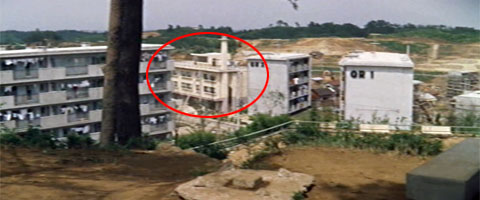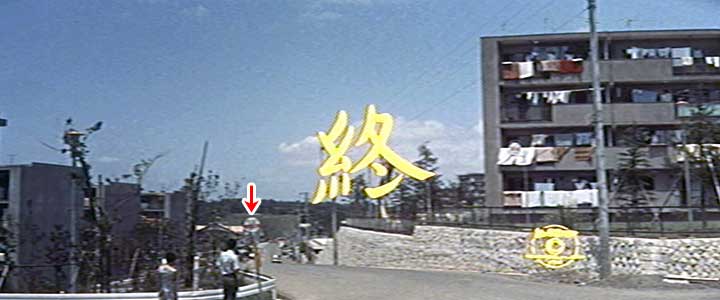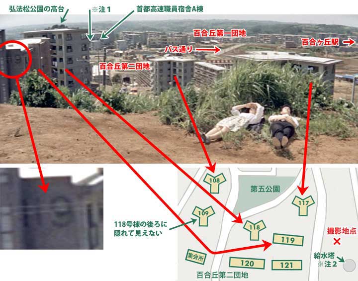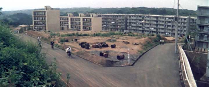 「ねえ、大学行ったら何やんの?」 「オレ、ほんと言うと行きたかないんだよ、大学なんかに。百姓やってる方がよっぽどいいと思うな」 一郎と桃子が、団地を見下ろす高台で昼寝をしている。弘法松公園での一件以来、二人は親密な仲になったようだ。一郎は高い場所でのんびり昼寝をするのが好きなようだ。このあたり、近代化ばかりを歓迎しない一郎の考え方の表現だろうか。 そして二人は起きあがり一緒に弁当を食べる、というシーンがある。 しかしこのシーンの撮影地はどうやら先ほどの弘法松公園とは違う場所のようだ。どこなのだろう。 前出のKさんよりご連絡をいただいた。ここは旧第二団地の東側、現在は給水塔がある高台の近くということだ。 そうだったのか。 場面の写真をごらんいただきたい。いろいろと書き込みをしたので見にくくなってしまったが、遠くに団地の群れが見えて、手前すぐ近くにも何棟かが見える。 画面の左端の棟にうっすらと「119」という棟の号数が写ってるのがなんとか見える。Sさんにある団地配置図と照らし合わせてみた。撮影場所が現在の給水塔近くだとすると確かに「119号棟」はすぐ近くだ。それとY字型の棟(スターハウスというらしい)が該当する位置に3棟見える。その先に写っているのは工事が続いている第二団地。さらに先に見える団地の群れが第一団地だろう。後で登場する孫作がトラクターで通った、百合ヶ丘駅に通じる通りも見える。なるほど、なるほど、ここだったのか。 しかし二人が弁当を食べたと思われるこの高台、現在もまだ残っているのだろうか。 当時カメラが据えられたと思われる位置の近くにある給水塔は現在もそうとう高い位置に建っている。しかし給水塔を残し、隣接するその北側一帯は切り崩され平地になり、現在は住宅が建ち並んでいる。 カメラが据えられたのはどのへんの位置だったのだろう。仮に現在は住宅になっているあたりであったのだとしたら、当時と同じ位置からの撮影は、住宅の屋根の上にでも上がらせてもらわないかぎり不可能だ。いや、それでも低いだろう。なにしろ画面を見ると団地の屋上を見おろす程の高さなのだ。 |