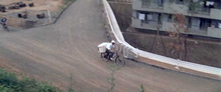 ![]() ![]() (撮影・MasterJOKERさん 2012・04・21) 空地の角を猛スピードで通り過ぎる九作の自転車。 この引っ越しを見つけて駆けつけるシーン、私も弘法松公園を訪れた時に撮影してみたのだが、MasterJOKERさんのようには撮れなかった。 急な斜面に樹木や草が覆い茂り、滑り落ちるのに気を付けながら、そうとう身を乗り出さないとこのようには撮れないのだ。MasterJOKERさん、かなり危険な体勢をとっていただいたのではないでしょうか? |