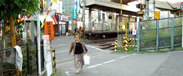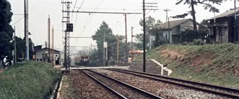 踏み切りを渡る九作。当時のこの踏み切りは警報機はあるが、開閉するバーは無いようだ。 線路の向こう側に見える西生田駅南口には1〜2階建ての商店が建ち並んでいる。西生田駅は画面の右端。 |