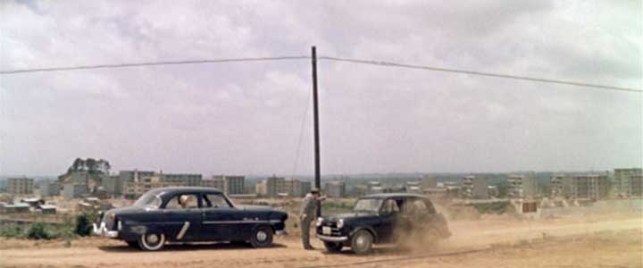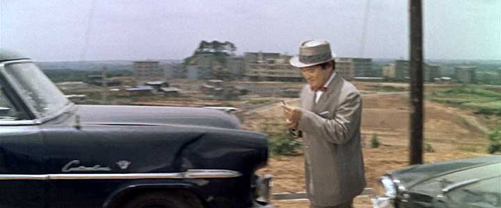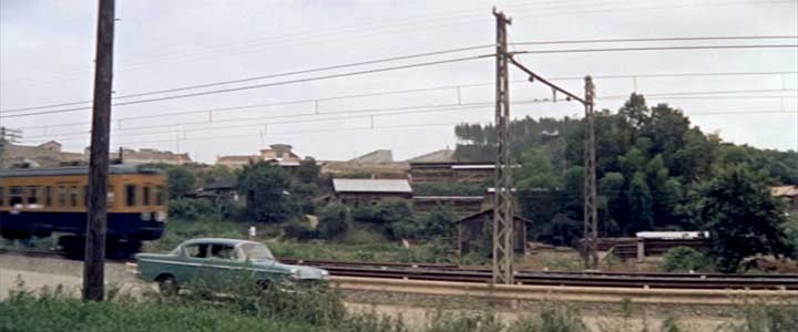 「ここに駅ができるんだね? それは確かな情報なんだね?」 桜井(フランキー堺)の乗った車が、道路の傍らに停車する。 道路は小田急線の線路のすぐ脇を平行して通っていて、線路と道路とはガードレールで仕切られている。 団地が出来たために小田急線に新駅が出来るという噂を聞きつけ、その予定地と目される場所にやってきたようだ。 線路の向こうはまばらに民家が建っているものの、多くの部分が林や畑、あるいは水田のようで、一見これといった特徴は見当たらず、当時のありふれた線路沿いの風景に見える。どこなのだろう。 |