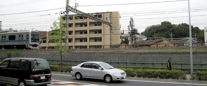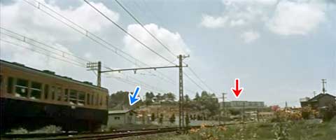 ![]() (1961年航空写真・国土地理院) 映画では線路から、ごくおおよそ10メートル程度は離れた位置から撮影しているように見える。 しかしこの百合ヶ丘駅に到着する手前の地域の現在は、小田急線と併走する県道3号線(津久井道)との間に建物が建ち並び、作品撮影時にカメラが据えられた位置には立つことができない。 今回のように建物の脇から無理して近づくとかえって近寄り過ぎざるをえず、線路から2メートルほどの位置からの撮影になってしまった。 この撮影位置を特定されたSさんはこう考察する。(いただいたメールから整理、抜粋) 多摩川越え直後の急行が疾走するシーンは、百合ヶ丘駅手前の部分だと思います。 確実な「証拠」はありませんが、遠くに見えるのが百合丘団地であろうというのが最も強い根拠です。 中央やや右遠方に見える3つが部分的に重なった建物は、左から順に第一団地6号棟、1号棟、2号棟の様です。(赤矢印) この後、これらのさらに手前に住宅公団の職員宿舎が3棟建てられることになります。この画像は職員宿舎建設前のようです。 線路左側の小屋とその右に並んだ立木は、多分川崎市の下水処理場ではないかと思います。(青矢印) 現在は川崎市上下水道局北部下水道管理事務所となっています。 整理すると次の理由で、百合ヶ丘駅手前と判断しました。 ●線路際まで丘が迫っていることから、多摩川を渡って多摩丘陵地域に入ってからの場所であることはまず間違いない。 ●中央やや右奥に3つ見える建物は、その形状、高い位置、並び方、前面の擁壁(現物は石垣で、今も残っている)の形状から第一団地の1号棟付近の建物と思われる。 ●線路左側の小屋の存在と周辺の立木で囲まれたエリアの大きさが、当時下水処理場だった現在の川崎市上下水道局の施設と良く似ている。 ●前述の下水処理場と思われる場所の左側と右側に尾根の終端と思われる部分が見える。これは、現在の地形と一致する。 左側の尾根(もしくは丘)の上には川崎市営高石団地があり、右側は現在の百合ヶ丘配水塔から続く尾根の終端であると思われる。 ●当時も現在も、小田急線の線路と県道3号線の間には15m以上の距離がある。現在はこの空きの部分ほぼ建物で埋められている。今はこの土地の高さは県道と同じだが、線路側から見ると、線路の高さからコンクリートでかさ上げしてある建物があり、また、県道より1m以上低いままで残っている部分もある。よって、当時は線路と同じ高さであったものと推定できる。 撮影時にこの場所は休耕中の畑か空き地か? 実際、当時、百合ヶ丘駅近くの県道北側は畑ないしは水田だった。 という根拠であるのだ。・・・うーーん、しかしこれは凄い。しかしなんでこんなに凄いのだ!! そしてこのあと物語は西生田駅(現読売ランド前駅)付近から始まる。しかしその西生田駅を通り越して、ストーリー設定上はまだ開業していない、その先の百合ヶ丘駅近くまで来てしまうのは何故だろう。それは「東京駅から出発して、現在建設が進んでいる百合丘団地が見えるところまで来ました」と監督は見せたかったのだろう。そこでちょっと戻り、西生田駅から物語を始める訳だ。 Sさん、今回の巡礼では本当にお世話になりました。おかげさまで私としては大変に充実した巡礼を行うことが出来、楽しませていただくことができました。本当にありがとうございました。 |