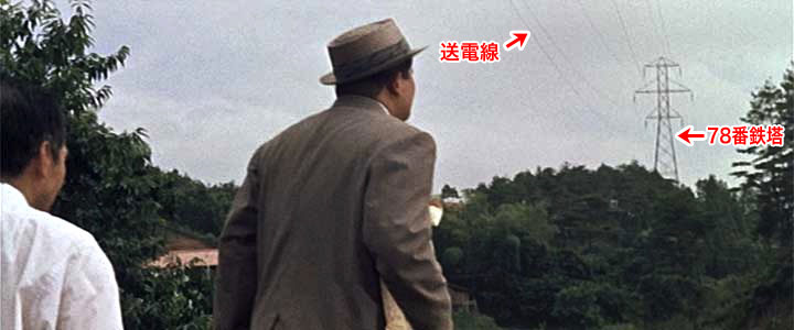再びSさんからのメール。 「フランキー堺が「百合ヶ丘駅予定地」を視察する場面がありました。線路の中に入ってしまうというのは今から考えれば驚きです。列車往来妨害罪で逮捕ものです。 この場面で中央にフランキー堺(桜井)の後ろ姿があり、右上方に鉄塔が見えている場面があります。 この鉄塔は、その位置(山の上)と高圧線の方向、小田急線との位置関係および百合ヶ丘駅近くであろうという条件から特定できます。 これは東京電力の桜ヶ丘線78番という鉄塔で、現在も同じ場所に立っています。 この線は昭和初期から使われているようなのですが、よく見ると映画に写った鉄塔と現在の鉄塔では形状がやや異なります。 桜ヶ丘線78番の建設年は分からないのですが、たとえば同線76番は 昭和60年(1985)に建て替えられています。さらにたどると、72番が映画に写った78番とほぼ同等の形状でした。これは昭和14年(1939)建造です。 そこで推測するに、78番は映画撮影後、昭和の後半に建て替えられ、若干形状が変わっているものと思われます。 この事実から、「駅予定地視察」の撮影地は次の場所付近に特定できます。 この場所は、現在ある鉄塔桜ヶ丘線77ー1番の近くになります。フランキー堺はこの付近から南東方向を小田急線越しに見ていたのです。 乗用車が停止したところの後遠方に少し頭が見える2つの建物は、第一団地の一部であろうと思います。41、42号棟あたりか。 目の前に水田が広がっているのにはびっくりしました。 当時は78番からの高圧線が小田急の線路を越えて北西側の里山の上にある77番との間に渡されていました。現在は77番が取り壊され、跡地には広大な敷地をもつマンション群があります。 取り壊された鉄塔のかわりに新規の77番と77ー1番の2本ができ、間は地中ケーブルで接続されています。77ー1番は、小田急線の反対側のほぼ同じ場所にある78番とつながっています。 すごい! 上図はこの鉄塔と送電線による撮影地点特定の概略図。 78番鉄塔からこちらに向かって伸びている送電線を直線で示してみた。 映画製作時は78番鉄塔から77番鉄塔(当時)へ、現在は映画製作時とほぼ同じ位置に立っている78番鉄塔から新しく出来た77−1番鉄塔へと結ばれている。旧77番、77−1番の位置は、距離的にはずいぶん離れているが、78番鉄塔から伸びる送電線の方向は大きくは変わっていないことがわかる。 下の比較写真を見ていただきたい。78番鉄塔から伸びる送電線が、こちらに向かってやや左方向に伸びているのがなんとか見える。現在も送電線が同じ方向に見える地点が撮影地点ということになる。 ![]() ![]() (撮影・2012・07・01) 78番鉄塔、当時と現在では形状は非常に似ているが、よく見ると微妙に形が変わっている変わっているのがわかる。1967年2月、駅前団地から6年弱後、鉄塔は建替えられているのだそうだ。(Sさん調べ) ![]() ![]() (撮影・2012・07・01) Sさんからのメール。 なお、百合ヶ丘駅で小田急線に並行する県道(世田谷通り、津久井道[つくいみち]等とも呼んでいます)がありますが、小田急線は新百合ヶ丘駅がなかったころは、次の柿生までこの道路とほぼ並行していました。 現在は前述の「駅予定地」あたりから山を崩して作った新百合ヶ丘駅にまっすぐ入っています。 旧ルートは一般の車道となり、どこに線路があったかはわかりません」 もう一度、桜井が車を停めたシーンと、送電線概略図を見てほしい。 当時は小田急線の線路と県道3号線の高低差がほとんど無い。しかし現在の撮影地点だと線路の方が2メートル以上も高い位置にある。その理由もこれでわかった。新百合ヶ丘駅を開設した時に線路は新しいルートに移行し、その時にこの高低差が生じたのだろう。 いや、しかし面白かった!今まで何気なく見過ごしてきた高圧線の鉄塔からロケ地が特定できるとは思いもよらなかった。 |