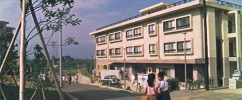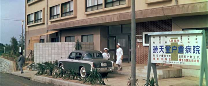 開始より1:27(神奈川県川崎市麻生区百合丘・大同生命相模寮) 新築した戸倉病院。あの歴史ある建物の「暁天堂戸倉医院」は近代的なビルの「暁天堂戸倉病院」となった。 この建物は保険会社の寮である建物(大同生命相模寮)を新築の病院に見立てて撮影に使用されたようだ。 旧暁天堂戸倉医院は川崎市高津区久本(最寄駅は東急田園都市線、大井町線の「溝の口」)にある明治から伝わる療養所であった屋敷の門が保存されており、それが撮影に使われたが、新築の暁天堂戸倉病院は物語の設定通り、百合丘での撮影となっている。 「暁天堂戸倉医院」が溝の口で撮影されたのは古くからある病院を表現するのに最適な物件が残っている、という都合であって、設定は西生田(現読売ランド前)、あるいはその隣の百合ヶ丘駅近辺であると思う。では設定上、新築した新戸倉病院は旧戸倉医院と同じ場所に建て替えられたのか、あるいは新しく取得した土地に建てられたのか。その辺りのはっきりした説明はない。冒頭で戸倉院長が父親(左卜全)に孫作(伴淳三郎)が、農地を宅地として売りに出しているので、そこを購入し越したらいいのではないかと相談しているが、はっきりした結論は出ていない。私は旧戸倉医院を取り壊し、同じ場所に建て直した設定もありだと思う。団地が出来、百合ヶ丘駅ができる前は田舎然としていた土地が近代的に発展し病院も新しくなった、という表現。旧戸倉医院と新戸倉病院を同じアングルで比較しているのも意図されたものの気がする。 |