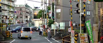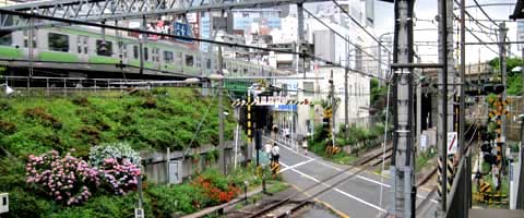 (撮影・2012・06・10) 二番目に映し出されるのは代々木駅南側付近。画面奥が代々木駅、新宿駅方向。新宿駅から代々木駅まで平行して走っていた山手線と中央・総武線が分かれる地点だ。 左の斜面の上を走っているのが山手線。まだ小豆色の車両だ。同じ高さで右に分かれるように走っているのは(見にくいが)中央・総武線。山手線と並んで斜面の下を通る線路は山手貨物線だ。(現在は埼京線・湘南新宿ラインが使用している) 現在の写真に踏切が写っているが、作品の場面では建物の陰に隠れてしまっている。 現在のこの地域、ビルが建ち並び、同じ位置からの撮影は不可能だったが、なるべく近い位置から撮影。 |