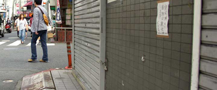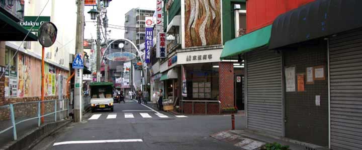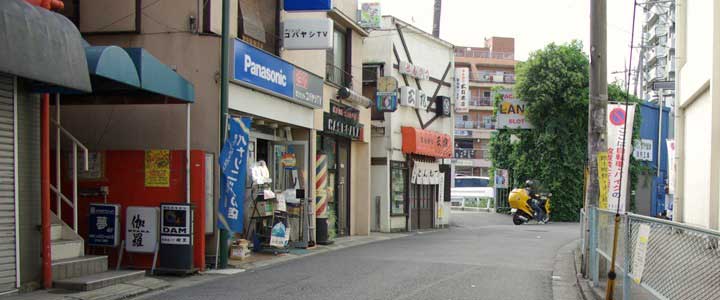 ![]() ![]() (撮影・2010・10・03) この飲み屋は西生田駅南口の線路と平行した道沿いにある。先ほど九作が巡査を振り切って駅前を通り過ぎて行くすぐ先の場所だ。 50年近くを隔てて同じ場所を同じようなポーズの青年が歩いていた。 高砂亭の前を通り過ぎる人々。 高砂亭とは路地を挟んで向こう隣に「パーマ・スズラン」と書かれた看板が見える(画面中央)。これはロケ地特定の手がかりになりそうだ。 ![]() ![]() (撮影・2010・10・03) この「高砂亭」があった場所を探すため、「読売ランド前」「スズラン美容室」などのキーワードで検索してみた。すると「スズラン美容室」はどうやら現在でも存在するらしいことがわかった! その隣が「高砂亭」があった場所ということになるのだが、地図で「スズラン美容室」付近の道路の形状などを調べると、どうも「スズラン美容室」の位置に納得がいかない。線路と平行した通りの角地にあるはずなのだがどうも違う。うーん、どういうことだろう。 悩んでいるとロケ地探しに日頃から協力していただいている某氏からの報告。「判明しました!『パーマ・スズラン』は場所を移転しているんです!」 そうだったのか!「スズラン美容室」が移転する以前の場所(移転といってもごく近い場所になのだが)だと映画画面と様子が一致する。万事解決だ。後述する森繁の乗った自動車がエンコ(今言わないか。車が故障して止まっていること)している場所とも辻褄が合う。 シャッターが閉まっている店の場所が「高砂亭」、路地を挟んで向こうの角の店が以前「パーマ・スズラン」であった場所だ。 (協力・タニーさん・シー9156さん・ミシェンヌさん) |