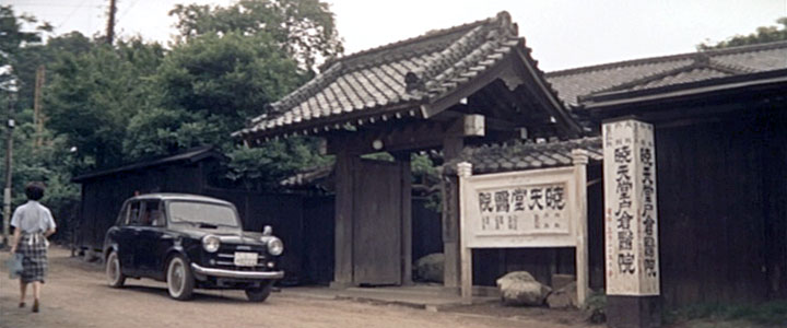開始より0:06(神奈川県川崎市多摩区西生田) 九作を「高砂亭」まで追ってきた巡査が外に出てみると車が故障して停まっている。古くから地元で「暁天堂(ぎょうてんどう)戸倉医院」という病院を経営する戸倉院長(森繁久彌)の車だ。先ほどバイクとぶつかりそうになり、その時の急停止でエンジンが止まってしまったようだ。 「高砂亭」の女の子達にも手伝ってもらって車を押すとエンジンがかかって去っていく。 |