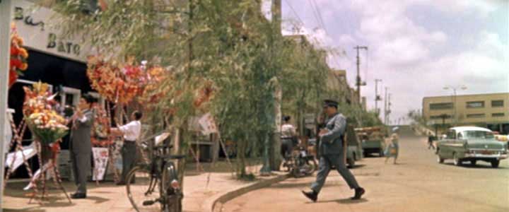 開始より1:25(神奈川県川崎市麻生区百合丘・小田急線百合ヶ丘駅前) 巡査(千葉信男)が「百合ヶ丘」駅前に新しくオープンした桜井(フランキー堺)と君江(淡路恵子)が経営するバー「ベーロ」の様子を見に行く。 |