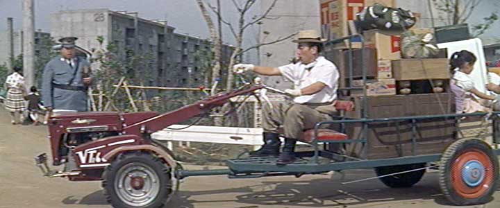 開始より1:24(神奈川県川崎市麻生区百合丘・百合丘第一団地(現サンラフレ百合ヶ丘)付近) 孫作(伴淳三郎)がトラクターに荷物を乗せて引っ越しをしている。 |