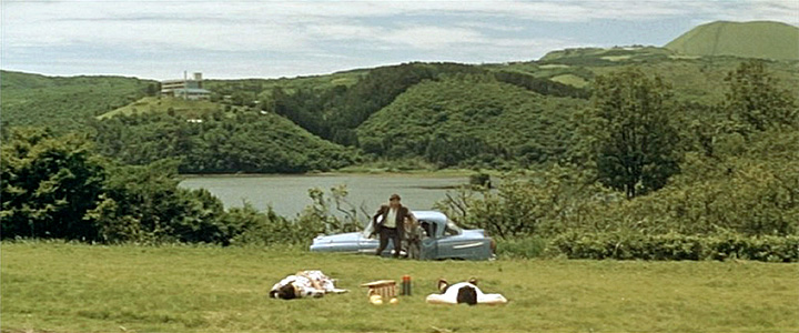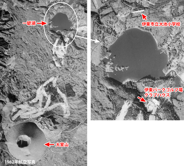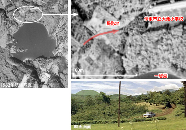 伊東、というがここは伊東の何処なのだろう。 入江のようになった海が見えていて、画面右奥に表面がなだらかで、お椀を伏せたような美しい形をしている山が見える。この特徴的な山は伊東市の「大室山」(おおむろやま)だ。毎年、山焼きが行われることで有名な山で、現在は活動していない火山だ。しかしこの場面の撮影地がどこなのか、これまで深く考えたことがなかった。 久しぶりに百合丘のSさんさんからメール。 「眼下の水面は当然海であろうという先入観の元、伊豆半島の東岸の伊東から川奈、 城ヶ崎海岸付近を探しましたが映画のシーンと地形が合う場所がみつかりません。 長い年月の間に人の手が加わった部分は多いと思いますが、自然の地形は大きく変わって はいないはずです。 延々と探して見つからない中、ふと思いついたのが陸地の「水面」です。 大室山に縦に 走る2本のスジ、リフトおよび(たぶん)頂上の売店などへの補給用ルートの位置から 再度検討した結果、「一碧湖」(いっぺきこ) にたどりつきました。 伊東の駅からほぼ南へ5キロほど離れた場所です。 大室山までは約3キロ。」 作品の公開翌年にあたる1962年の12月10日に撮影された航空写真があるので見てみる。