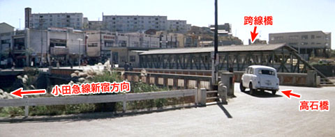 ↑ 「喜劇 駅前飯店」(1962)にも百合ヶ丘駅付近がロケ地に使われ、当時の跨線橋が写っている。 これは百合ヶ丘駅の北東側からその跨線橋を見たシーン。百合ケ丘駅は切り通しになっているので、跨線橋の上部がまるで地上に建っている建物のように見える。ここから階段を下ったところがホーム。 跨線橋の手前には跨線橋と並んで高石橋が見える(車が渡ろうとしている橋)。 |