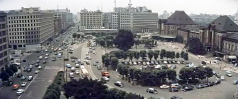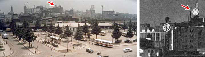 (撮影・2015・12・30) まず最初はオフィス街の象徴として東京駅から出発する。画面右側に丸の内中央口、北口、二つの屋根が見える。左側が丸ビル。カメラが据えられたのは位置、高さから推測して当時の東京中央郵便局(5階建)の屋上だと思う。 現在の中央郵便局は敷地内に「JPタワー」として高層化されたが、旧東京中央郵便局舎の一部も保存、再生されており、「KITTE」という商業施設になっている。その旧局社の屋上が開放されているので、当時とそれほど違わない位置から撮影できた。 |