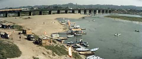 (撮影・2012・07・01) 小田急電車が登戸駅の手前で多摩川を渡る。 ここは小田急線の北側から小田急線多摩川橋梁を見ている。電車は左から右(東から西)に多摩川を渡る。 当時は川遊びとする人たちが大勢詰めかけたそうだ。貸しボート屋が見える。この店は現在でも営業されているようだ。 |