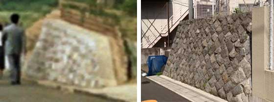 ↑ 「確認のため石垣部分だけを拡大しました。現在はマンション建設に合わせて石垣の手前側が削られてしまっていますが、石垣の奥側の断面の角度は当時のものとほぼ変わっていません」 |