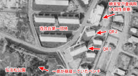 ![]() ![]() (撮影・2012・07・01) 作品場面で画面左遠方に弘法松(こうぼうのまつ)公園(後述)の高台が見える。そこから右に並ぶ建物群が百合丘第一団地の棟々。 病院開設候補地と設定された場所は現在、駐車場になっていた。同じ位置に立って弘法松公園を同じ方向に見ると、その右方向には当時とは違う、もっと高層の建物が見える。第一団地跡地に建替えられた「サンラフレ百合ヶ丘」の建物群だ。 |
