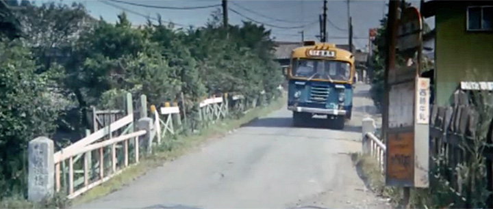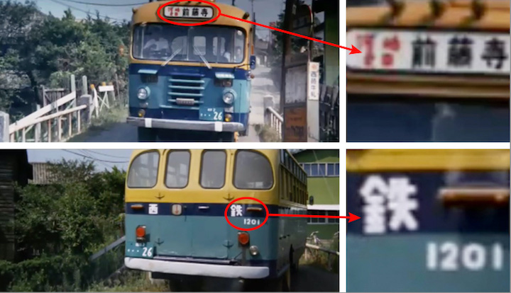 作品にテロップで 「実は、この村はひそかに泥棒村呼ばれ福岡県K村に実在している。村民二百余人は全て血縁で結ばれその前科は〆めて三百九氾、年に二億円の荒稼ぎを誇る日本一の大万引集団なのである。また彼らの言う『ひと航海』華麗なる出稼ぎが開始されたのである」 「この映画は、新聞記事にヒントを得たものですが、内容、人物、団体、地名等はフィクションであり、実在のものとは、一切関係ありません」 と出る。しかしその新聞記事(『こちら特報部・泥棒村潜入記』東京新聞、1971年1月3日〜1月15日に連載)に書かれていたことはもちろん実話で、福岡県に実在した窃盗集団を取材したものなのだそうだ。 実話が元、というのは脚色はされているとはいえ、これまでのクレージー作品とは真逆でこれも面白い。 この窃盗集団については、1966年に結城昌治(推理作家)により『白昼堂々』というタイトルで小説化もされている。 このサイトの読者様から「喜劇 泥棒大家族 天下を盗る」のロケ地が何処なのかを知りたい、とのメールを頂いた。読者様はこの作品にとても興味を持ち、原作にある福岡県の田川郡川崎町まで行ってみたとのこと。しかしロケ地特定には至らなかったそうだ。 作品を見返してみると、確かにどこかの炭鉱跡をロケ地にしてはいるようだが、九州の筑豊炭田と特定できるような明確な材料が映らない。「西鉄」の路線バス(福岡県を中心に運行)が村にやって来るくるくらいのものか。これは難しそうだ。 いつもロケ地を一緒に考えている知人に相談してみた。 その中のHさんは 「この『西鉄バス』は怪しいですよ」と言う。 「中古のバスに塗装したのかも知れませんね。後部の『鉄』の文字が粗い気がします。前面の『方向幕』の文字も手書きですね。それに、1972年にこんな古い型のバスを大手の西鉄が使っていたと思えません。これは確実にこの作品用に作った劇用車だと思います」