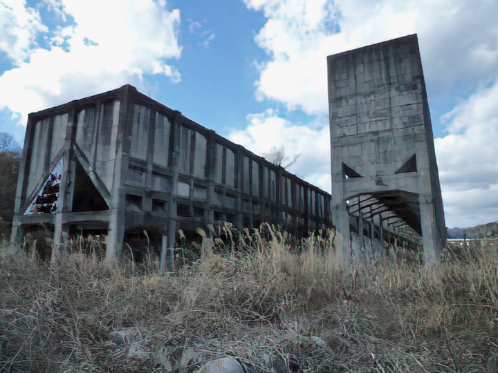 ↑ 写真上:作品中に登場する「東タクシー」写真下:現在の「東タクシー」 茨城県! 茨城県北部というと、福島県から広がっている常磐炭田の一部だ。撮影地は九州の筑豊炭田ではなく、常磐炭田なのだろうか。 「西鉄バス」も「東タクシー」も福岡ナンバーを付けてはいるが、これはどうにでもなる。 現在は廃坑になっている常磐炭田の設備跡を訪ねたサイトを、いくつかHさんが見つけてきてくれた。その中でも「歩鉄の達人」さんというサイトの中に、茨城県にある「神ノ山鉱」という炭鉱跡を訪ねた記事があり、巨大なコンクリートの建造物が写った写真が掲載されていた。写真使用の許可が頂けたのでここに転載させていただく。 ↓ まずは映画からの一場面を見てみよう。背景に二基の巨大なコンクリートの建造物が見える。 ![]() ↓ そしてこちらが「歩鉄の達人」さんに掲載されている写真。 ![]() ↑(写真出典・「歩鉄の達人」さん 撮影:2012・03・04) 二基のコンクリートの建造物の形状、配置が一致している。 まず間違いないだろう。映画のロケ地は「茨城県北茨城市関本町八反」に存在した「神ノ山鉱」だ。 この巨大なコンクリートの建造物は何か。これは「貯鉱槽」と呼ばれるものだそうだ、採掘された石炭が上部に貯えられ、引込線により下部に入り込んだ貨車に「ホッパー」と呼ばれる「じょうご」のような装置を使って石炭が落とし込まれる仕組みになっている。 やはりロケ地探索の知り合い、Tさんはこの「神ノ山鉱」が写っている1960年代の航空写真を示してくれた。上記の二基の「貯鉱槽」がはっきり写っている。(「橋」と示してあるのは後述) ![]() ![]() ↑ これは現在の航空写真。廃鉱になっているので粗方の施設は解体、更地化されているが二基の「貯鉱槽」だけは現在も残っているのが分かる。(2020・Googl Earth) ↓ 映画に登場する炭鉱は、橋を渡ると入り口になっている。映画の冒頭では例の「西鉄バス」が渡った橋だ。これもTさんが特定。 ![]() 映画を見ていると、福岡県の筑豊炭田だとばかり信じていたのが、実は茨城県の常磐炭田。これだから映画は面白い。 しかし意外なロケ地だと分かり、お尋ねになられた読者様、もしかしたら、がっかりされはしなかっただろうか。 今回は意外なロケ地だったせいもあるのか、特定作業、とても楽しませていただきました。お尋ねいただきありがとうございました。 (協力:原田さん・麻布田能久さん Vさん 写真提供:「歩鉄の達人」さん) |