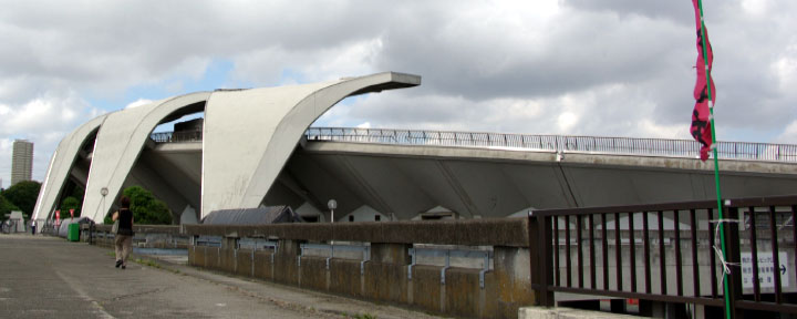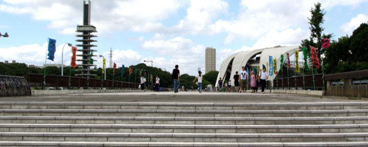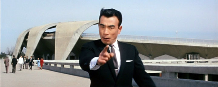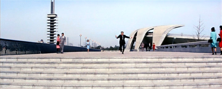 開始より1:17(東京都世田谷区駒沢公園・駒沢オリンピック公園) 中等が突然駒沢オリンピック公園に現れ、歌うシーン。 1964年以降の娯楽映画ではオリンピックの近代的な建築が登場することが多くなった。 |