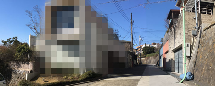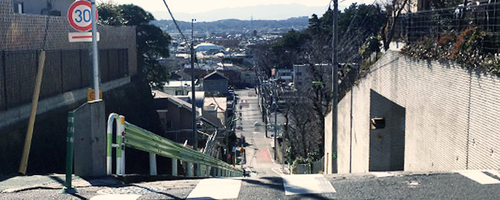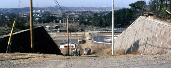![]() ![]() (撮影・2017・02・21) ↑ 高台から多摩川方面に向けて、かなり急な下り勾配だ。この辺りは坂と石垣が多い。 坂の下から引越しのトラックがやってきて、春山部長の新居に向かうため右折しようとしている。このトラックが向かう方向は実際の状況にだいたい沿っている。 当時はこの坂道、未舗装だったようだ。現在はガードレールがつき、歩道はあまりの勾配のため階段になっている。新旧、電柱の位置が変わっていない。 (協力・麻布田能久さん) |