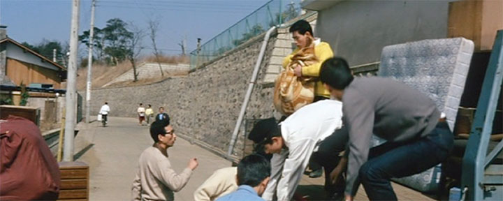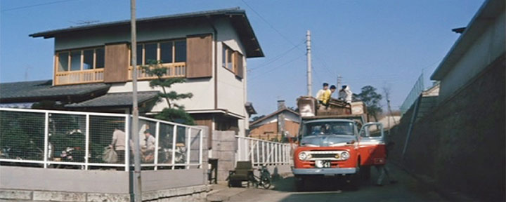 開始より0:47(東京都世田谷区岡本3丁目) 後藤又自動車の新入社員、中等(なか ひとし)(植木等)は父親(中村是好)の教訓を実行しているゴマすり男だ。 ある日、上役の春山部長(有島一郎)が引っ越しをすると聞き、早速手伝いに向かい、ゴマすり男ぶりを発揮する。 劇中で有島は「世田谷の上野毛(かみのげ)に家を新築したんだ」と言っているが、ロケ地は同じ世田谷でも上野毛からはやや離れている岡本という高級住宅が並ぶ地域だ。 |