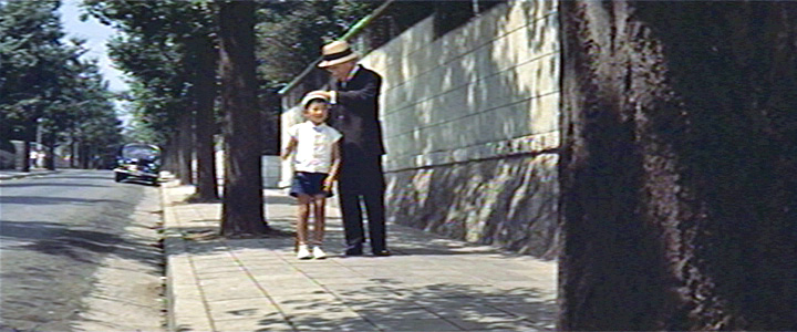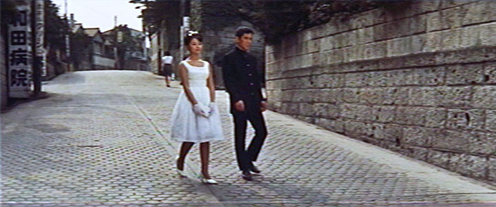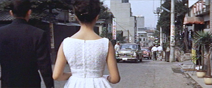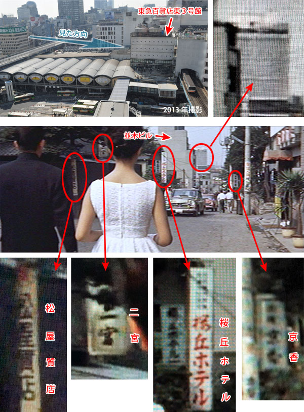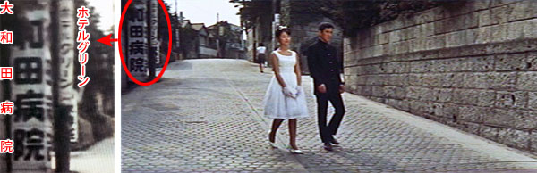 ↓ 学生のたね子(星由里子)は、自分の父親の元恋人の息子であり、偶然同じ大学に通う学生である新太郎(加山雄三)とともに、前出の沢田(東野英治郎)結婚式に出席する。 結婚式の帰り、坂道を下りながら結婚について語り合う二人。 ![]() ![]() (撮影・2018・11・15) ↓ カットが切り替わり、今度は二人の後ろ姿になる。 この坂道はどこだろう。 結論を言うと渋谷駅のすぐ南側、桜丘(さくらがおか)町だ。 ![]() ![]() (撮影・2018・11・15) ![]() ↑ まず最初のカット、二人がこちらに向かって坂を下ってくる場面から見てみることにする。 画面左端に「大和田病院」と書かれた看板と、「ホテルグリーン」と書かれた看板とが見える。 両方ともそれがそこにあるということではなく、看板が立っている角を入るとそれらがあるということだ。 作品公開から7年後になってしまうが、「1969年住宅地図」(「麻布田能久」さん提供)を見てみる。下図の左下の住宅地図がそれだが「大和田病院」「ホテルグリーン」が読み取れると思う。青矢印は加山、星が歩いた方向だ。 映画画面右側に見える石垣の敷地には、現在「セルリアンタワー 東急ホテル」が立っている。 ![]() ↓ 次に、カットが切り替わって二人の後ろ姿の画面を見てみる。 駅に近づいたせいか、だんだん賑わってきた様子だ。先程のカットの坂道と同じ道のはずだが。いやいや、どうもそうではないようだ。ここでも画面に写っている看板などを見てみよう。ヒント満載だ。 下図にある映画画面の左から順に見てみると「松屋質店」と電柱の広告がある。その右に「二宮」と書かれた看板。さらにその右に「桜丘ホテル」の看板。そして道路右側にはなんとか「京香」と読める看板が写っている。 先程の1969年住宅地図の右側の方を見てみるとそれらの店舗名が読み取れる。「松屋質店」は電柱の位置にあるのではなく、この先にありますよということだ。 二人の進む道の左側に、4、5階建てくらいのビルが映っている。これは住宅地図にもある「並木ビル」。このビルは現存する。 そしてそのすぐ右側、遠くに当時としては大きいビルが建っているのが見える。これは渋谷駅に隣接して建っていた「東急百貨店東3号館」だ。しかし現在はすでに解体されて存在しない。 ![]() そんなわけで、加山、星の二人はカットが変わると東方向に道路二本分、約150メートルほど一瞬にして移動したことになる。しかしまあ映画にはよくある例で、驚くほどのことでもない。 写真を撮りに行った2018年の11月。ご存知のように渋谷駅周辺は2020年の東京オリンピックに合わせて大規模再開発が進行中で、「ヒカリエ」に続いて超高層ビルが次々に建設中であった。加山、星が向かう渋谷駅桜丘口地区も再開発の対象になっているらしく、山手線に近い一角では、すでに多くの店舗がシャッターを閉じている。 私は渋谷には全く暗く(中央沿線に住んでいる者としては渋谷にあまり縁がなく、子供の頃から買い物など、どうしても新宿、あるいは吉祥寺になってしまうせいか)とうとう渋谷についてはあまり分からないうちに大改造ということになってしまった。 ちなみに、1969年の並木ビルが載っているの方の住宅地図にある「日本会館」は「大冒険」(1965)で植木等と谷啓が住むアパートとして、「マツヤ(松屋)質店」は「クレージーのぶちゃむくれ大発見」(1969)でハナ肇の妻、春川ますみが金を工面しに行く質屋として登場している。 ↑ 最初のカットのストリートビュー ↑ 次のカットのストリートビュー |