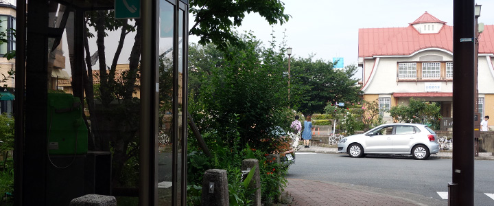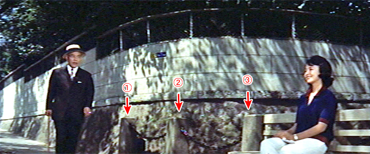 ![]() ![]() (撮影・2018・06・24) ↑ 田園調布駅の西側、駅前に通ずる坂道を元華族の沢田(東野英治郎)が下りてくる。右側に見える銀杏並木、石垣と大谷石の塀が当時と変わらない。 ![]() ![]() (撮影・2018・06・24) ↑ 沢田の歩きに連れてカメラが移動し、駅前広場の角まで来る。するとベンチに座って待ち受けている女性の姿が映し出される。先ほどまで沢田が訪問していた多賀谷家の娘、たね子(星由里子)だ。 たね子が座っているベンチの左側にはコンクリートの柵柱が三本見える。しかし現在はベンチの位置に電話ボックスが設置されたためか、③は撤去されてしまったようだ。 比較写真では二本の柵柱の位置を合わせると、後ろの塀の見え方が全然違ってしまっている。撮影位置をもう少し右寄りにし、さらにもう少し後ろに下がり、しかももっと広角で撮影しなければいけなかったようだ。 ロケ地の現在を撮影する際には、いつも映画画面をプリントしたものを現地に持って行き、現在の様子と見比べながら当時カメラを据えたであろう位置と方向を推測する。時代が移り変わって大きく変化している場合もあるが、何十年も経った映画とあまり変わらない景色が眼前に展開することもある。そういう時は「おーっ!ここだ、ここだ」とやや興奮気味になってしまうのか、写真も「よっしゃ、これでOK! 」とその場ではうまく撮れたつもりになってしまい、簡単に済ませてしまうことが多い。ところが帰ってからよく比べてみると、各所に全然目が届いていなかったことに気付く。そんな失敗は何度も経験している。教訓を生かして、ここと決めた撮影位置から、念のために前後左右に移動して何通りか撮影したり、さらにカメラの高さも変えてみて写したりすれば失敗は少なくなると分かってはいるのだが、それがなかなか・・・。いやあ、巡礼の道は険しいです。 ![]() ![]() (撮影・2018・06・24) ↑ 二人は連れ立って駅の方に向かう。 田園調布駅のこの洋風の駅舎、映画撮影当時と現在、全く同じもののように見えるが、実は旧駅舎は東横線地下化のため1990年に解体され、現在の駅舎(駅舎としては機能していなくシンボル的なもの)は2000年に復元されたもの。 |