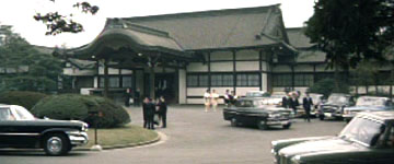 明治記念館は「社長洋行記」(1962 監督・杉江敏男)にも登場する。 桜堂製薬の本田社長(森繁久弥)の娘、めぐみ(中真千子 )と修司(江原達怡 )の結婚式場としてである。 新しもの好きの社長であるが、結婚などの行事に関しては伝統的な格式を重んじているという表現が、森繁社長の性格をよく表していると思う。 本館の左右に新しい建物を増築したようだ。しかし本館の細部は見事に保存されていることがわかる。 |