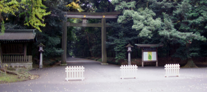開始より1:26(東京都渋谷区代々木神園町・明治神宮) 木村とタミエが式場の予約をしに行った上のシーンの続きで、二人歩きながら相談していると、偶然、孫のお宮参りに神社を訪れた社長家族に出会う。 しかしここは明治記念館ではなく、いきなり明治神宮だ。 明治神宮の入り口は、JR山手線の原宿駅近くから入る南参道がよく知られている。最初その入り口にある鳥居の場所だと予想し行ってみた。おお、ここだ、ここだ、と撮影位置を探す。しかしどうもぴったりとこない。とても似てはいるのだけれど微妙に違うのだ。 境内にある地図を見る。すると参道が南、北、西の三カ所あることがわかった。そのそれぞれの入り口に鳥居があるようだ。それだけではない。参道を進んだ本殿近くにも鳥居があり、明治神宮には全部で七つの鳥居があることがわかった。 とりあえず次に代々木駅に近い北参道にある鳥居の場所に行ってみる。小さな社のような建物からしてどうやらここのような気がする。 入り口に警備員室があったので、作品のワンカットをプリントしたものを見てもらい、 「この写真は昔の映画からのものなんですが、この鳥居、どこだか分かりませんでしょうか」 と聞いてみた。60代くらいの警備の人は親切に、 「うーん、雰囲気からしてこの北参道だと思うねえ」 と教えてくれる。 「ほう、これは古い写真だねえ。今は舗装だけど、まだ砂利道だもんねえ」 なるほど。気がつかなかった。さすがだ。長年ここで警備をしておられるのだろう。 違う写真にも気がついて「これは森繁だねえ。女の人は司葉子?」 「あ、いえ、小林桂樹と藤山陽子という人です」 間違ったとはいえ、東宝俳優の名が的確に出てきたところがうれしい。 明治神宮はその名の通り明治天皇が奉られており、造営は1915年(大正4年)から開始され、全国から13,000人もの国民が労力奉仕に自発的に参加したという。鎮座祭は、1920年(大正9年)11月1日に行われた。まだ100年経っていないのだ。 |