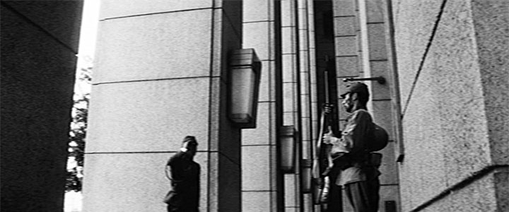開始より2:29(東京都千代田区皇居外苑・皇居前広場)![]() ![]() (撮影・2015・06・09) 二重橋、皇居正門前で自決する椎崎中佐と畑中少佐。 このシーンの撮影許可は出ていなく、ゲリラ撮影だったという。万が一のときのことを考えて、役者はともかく逃がすとして、監督自身は捕まる覚悟をしたらしい。岡本監督はブタ箱には歯ブラシが無いと聞いて、ポケットには歯ブラシを入れていたと聞く。 (協力・Kさん、Gさん) |