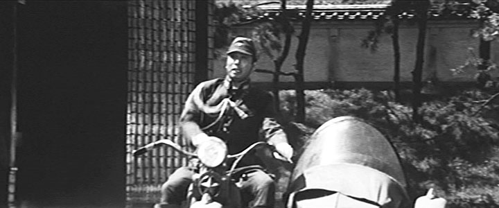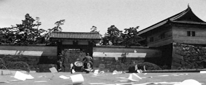 開始より2:22(東京都千代田区皇居外苑・桜田門) 玉音放送がされようとする日、終戦の反対を強硬に主張する陸軍将校の椎崎中佐(中丸忠雄)と畑中少佐(黒沢年男)はオートバイと馬を使ってビラを撒く。 ![]() ![]() (撮影・2015・06・09) |