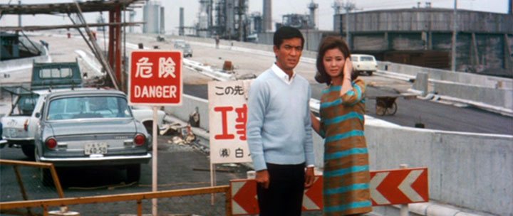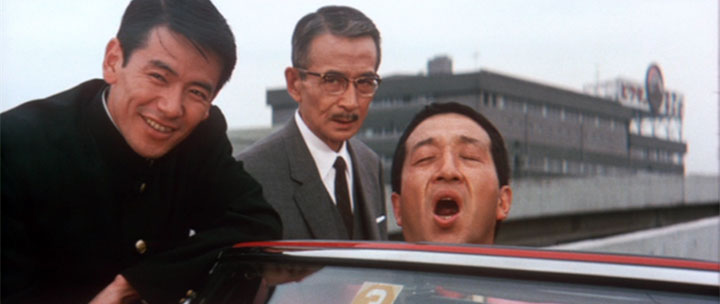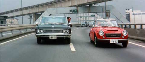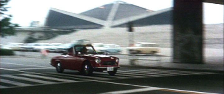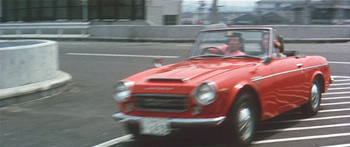 「それじゃあ澄ちゃんはブラジルで誰かと結婚するのか」 「わからないわ。でも今は雄一さん以外の人と結婚する気になれないの」 「あ〜!ちきしょう〜!」 ↓ 若大将のフェンシングの試合が終わり、会場からブラジルに向かうと言う澄子(星由里子)を乗せ、羽田まで送ることになった石山。石山の赤いダットサン・フェアレディ(2代目)が羽田に向けて走る。 |