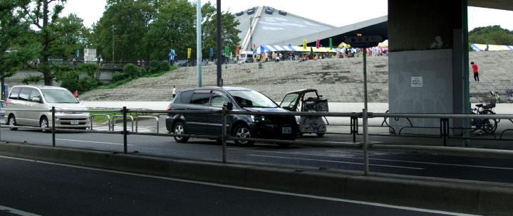 ![]() ![]() (撮影・2007・09・09) ↑ ここは駒沢オリンピック公園付近の駒沢通り。特徴のある競技場施設や、幅が広い石段が見える。 |