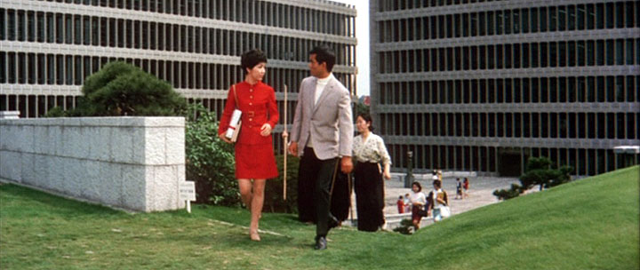 「優勝は僕たちがもらったようななもんだな」 「言ったな! よし! じゃあこうしない? 負けたほうが勝った方をご馳走するの」 「いいのかなあ。僕はかなりの大食いですよ。あなたのひと月分の小遣い、パーになるかもしれませんよ」 「まあ! もう勝ったようなこと言うじゃない」 ↓ 田沼(加山雄三)が谷村江美子(中尾ミエ)を訪ね、清明女子大学を訪れるシーン。大学に見立てたロケ地には、目黒区にある当時の千代田生命本社が使われた。 千代田生命本社は村野藤吾氏の設計により、アメリカンスクール跡地に建設されたが、経営破綻後、目黒区に売却され現在は目黒区役所として使用されている。 |