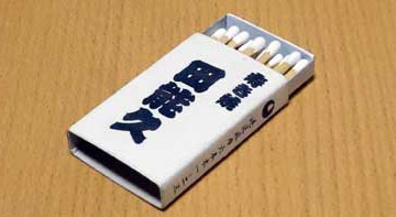 ↑ 以上の資料を元に「田能久」マッチを再現してみた。 マッチ店で何も印刷をしていない無地のマッチを購入し、プリンターで印刷した紙を貼り付けてみた。なかなかの出来である。笑。 |