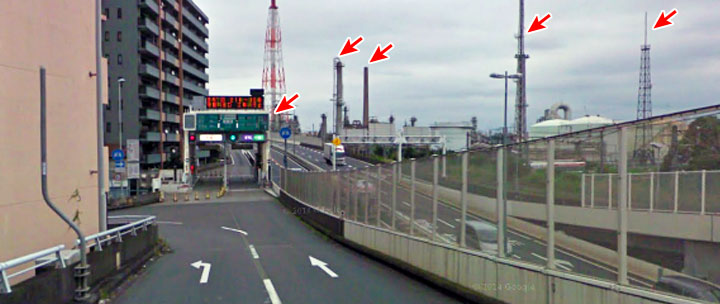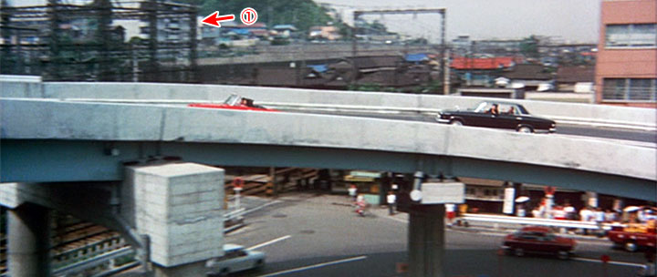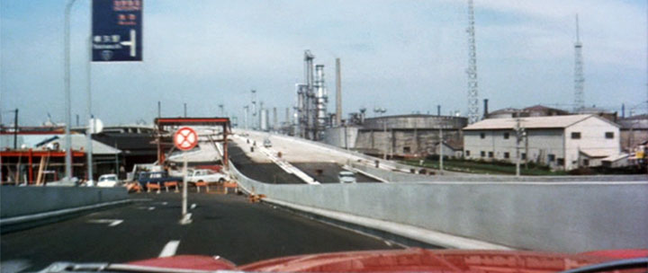 「おい! 石山! 馬鹿なことはよせ!」 「おい! 青大将! 車を止めろ! あっ! カーブだぞ! おいっ!」 ![]() ↑ 澄子を乗せた石山の車、赤いフェアレディは羽田に向かうため高速に乗る。 それを追う石山の父(中村伸郎)、江口(江原達怡)、田沼を乗せた黒の初代日産プレジデント。 上の場面、ここまでは間違いなく首都高1号羽田線だ。モノレールが上を跨いで通っている。確かに羽田に向かって走っている。 すると高速がこの先、急カーブにさしかかるようだ、江口が車から身をのり出すようにして、無茶な運転をしている石山に叫ぶ。「あっ!カーブだぞ!おいっ!」 ↓ 次のカットではカーブを曲がる二台の車が映し出される。 観客は当然ここも首都高だと考える。 私も深くは考えていなく、そう思っていた。 そこへ「年齢を騙している若大将」さんからのご連絡。 「首都高シーンで現在の住まい(横浜)の近くでロケが行われていたことに気づき、早速現地の撮影に挑んでみました」 実はこのカーブ、横浜市の京急新子安駅南側の駅前ロータリーから、その上を通っている神奈川産業道路へ螺旋状に登る(「ループ橋」というらしい)連絡道だという。 ここは首都高じゃないのか! ![]() ![]() (撮影・年齢を騙している若大将さん 2015・02・28 晴れ) ↑ カーブを曲がる二台の車。流し撮りだし、カット尺も短いので、ゆっくり背景を観察している間もない。 矢印① 現在は撤去されているが、京急本線の高圧門型鉄塔兼用の架線注だそうだ。これが撮影地特定の手がかりになったという。 矢印② このビルは外装に手を入れているが当時と変わっていないようだ。 矢印③ 京急本線を渡る踏切。 ![]() ↑ 京急新子安駅の北側の歩道橋から見た状況。(撮影・年齢を騙している若大将さん 2015・02・26 曇り) ↓ 急カーブをなんとか曲がり切った石山は交差点を突っ切る。(高速道路で交差点というのも、よく考えてみればおかしな話なのだが) ![]() ![]() (ストリートビューより・撮影時期・2009・09) ↑ 建設中の首都高速神奈川1号横羽線のランプを登り、神奈川産業道路を横切る石山の車。ここは自動車専用道路なので立ち止まっての撮影は不可能。現在の写真はストリートビューから。 ↓ するとその先は工事中のため通行止めになっていて、石山の車はそこへ突っ込み、ようやく止まる。 ![]() ![]() (ストリートビューより・撮影時期・2009・09) ↑ ここも自動車専用道路。 遠くに見える鉄塔や工場の建築物が一致。一番左の矢印は料金所ゲートの鉄骨。 ![]() ![]() (ストリートビューより・撮影時期・2009・09) ↑ 首都高神奈川1号横羽線の、浅田出入口-東神奈川出入口間の開通は1968年7月19日ということだ。その区間内にあるこの子安出入口が工事中というのは、撮影時期的(「リオの若大将」は1968年7月13日公開)にも合致する。 ![]() ![]() (ストリートビューより・撮影時期・2009・09) ↑ 嘆く石山を励ます石山の父親と江口。 ここも石山が工事中の所に突っ込んだ同じ場所かと思いきや、ちょっと違う。背景にビルが写っている。これは当時の日本ビクター本社(現JVCケンウッド)。これが見える遠近感と高速ランプの様子から判断して、ここは石山が最初に止まった位置からは数百メートル離れた位置になる。 ![]() ↑ このシーンの撮影地点を地図で表すと上図のようになる。 年齢を騙している若大将さん、今回は情報ありがとうございました。 脚本上、ヤケになった石山が、無茶な運転で高速の急カーブでハンドルを切りそこない、工事中の場所に突っ込むという状況を設定をし、それに似合ったロケ地を探したのか。それとも、そういう設定にはぴったりの場所が、工事中の今なら撮影可能なのを知り脚本に取り入れたのか。どちらなのだろう。 |
