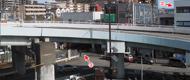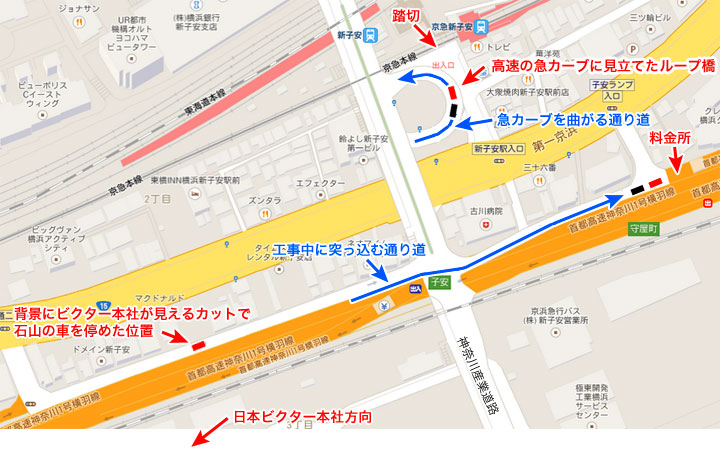 開始より1:38(神奈川県横浜市神奈川区子安通2丁目・JR新子安駅、京急新子安駅南側ループ橋〜首都高神奈川1号横羽線子安ランプ付近)