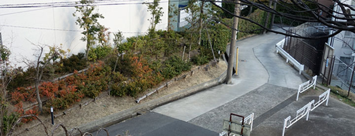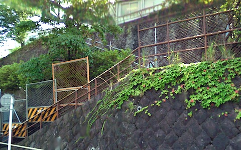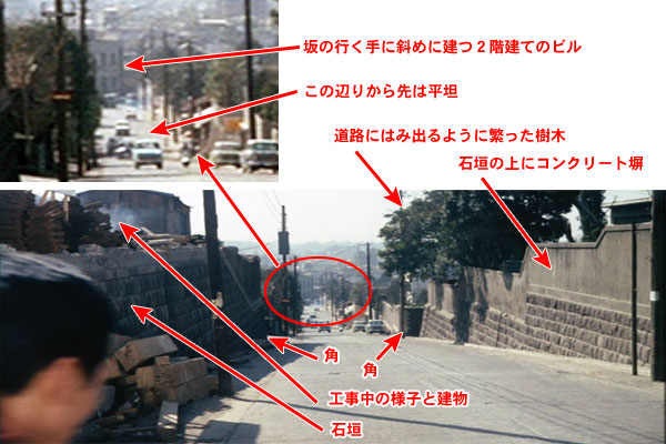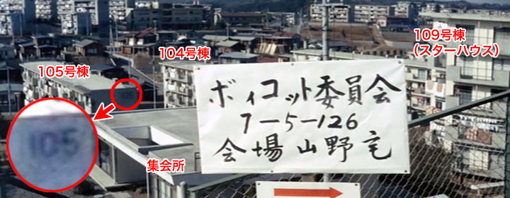 ↓ そして以上のことから判明したことを植木らが階段を上がっている場面に書き加えると、次のようになる。 この階段、現在でも存在し、第二団地跡にできたマンションへつながる階段として活用されている。石垣も保存されている。 ![]() |