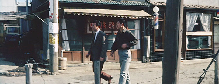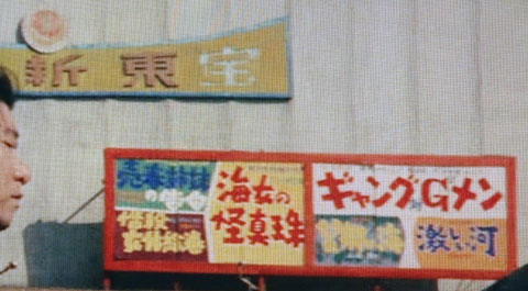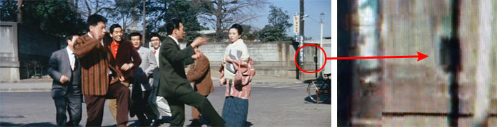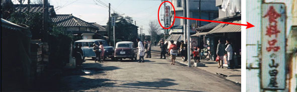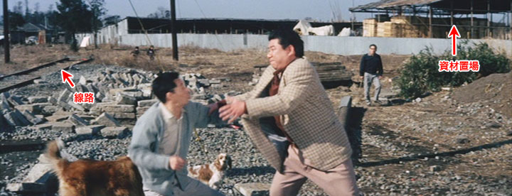 ![]() ![]() (撮影・2014・10・14) ↑ 植木らの向こうに2軒の商店が見える。左側の店は暖簾に「中華そば」と書かれている。中華料理店だったようだ、右側の店は赤、白、青がクルクル回るサインが見えるので床屋だろう。 ![]() ![]() (撮影・2014・10・14) ↑ その先の広い場所で二人の男が喧嘩をしている。砂利や石が置いてあるのが見える。背景には資材置場のような屋根。画面左には何やら線路のような二本の線が見える。 ![]() ![]() (撮影・2014・10・14) ↑ 上田らが喧嘩の仲裁に入ろうとすると、上手をいく仲裁屋が現れる。「喧嘩頂戴業」を名乗る花木(ハナ肇)だ。 背景には壁面に「用賀新東宝」と書かれた映画館。その左側に「用賀ストアー」と書かれた店がみえる。食品スーパーのような店だろうか ![]() ![]() (撮影・2014・10・14) ↑ この画面では「用賀新東宝」の右側に、先ほどの中華料理店、床屋が写っている。こういう位置関係だったのか。 このシーンが何処でロケされたのかは、テレビ放送で初めてこの作品を観た時から気になってしかたがなかった。 背景に「用賀新東宝」という映画館が映り、その左隣には「用賀ストアー」という食料品店(あるいは当時よくみられた何軒かの店が集まった食品マーケットかもしれない)が映る。その手前はかなりな面積の空地のような状態。石材や砂利が置いてある。「用賀新東宝」「用賀ストアー」という看板から考えれば世田谷区の用賀なのだろう。しかし検索サイトでは「用賀新東宝」「用賀ストアー」の情報が出てこない。映画館については、かつて用賀に映画館があったことまでは分かった。映画館はその後廃業してストリップ劇場になったという記述もみつかった。しかし場所の特定にまでは至らず、気にはなっているものの、詳細は不明の状態だった。 そこへ「喜劇駅前団地」ではお世話になったSさんからのご連絡。ロケ地の詳細が分かった。 やはりここは世田谷区用賀で間違いなし。当時は東急玉川線(通称「玉電」)「用賀停留所」から近い場所との情報。玉電は1969年に廃止されているが、現在は東急田園都市線の「用賀駅」(地下駅)が通っている。 「用賀」に馴染みの無い人でも、その地名は首都高とつながる東名高速の起点として名高いと思う。 やっぱり用賀だったのか。 Sさんは空地のような状態の場所に線路が写っていることに着目、東急玉川線の分岐線を1963年の航空写真からそれを見つけたと言う。すごい。 行ってみた。植木らと同じように床屋と中華料理店だった建物の前を通って、あの空地のような場所に出る。眼前に整備された広場やバスターミナルと高層建築。おお、ここだったのか!感慨は大きい。 映画館は薬局が入ったビルになっている。「用賀ストアー」だった場所は銀行だ。中華料理店だった所はガールズバー。しかし建物は変わっていないようだ。床屋さんは現在も商売を続けられている。 映画のロケシーンの中で「ここはいったい何処なんだろう」という興味から始まったこの「東宝映画のロケ地を訪ねる」なのだが、このシーンの場所などは、まさにそういった興味を、とてもかきたたせてくれる場所だったのだ。 ![]() 喧嘩をしている場面に映る二本の線、玉電から分岐してこの敷地に入る引込線の線路の終端が、画面からも航空写真からも確認することができる。 映画撮影当時は、付近を流れる多摩川で採れた砂利を、この引込線に貨物電車が入り建設資材として運んだらしい。その貨物電車を「砂利電」と呼んだという。 この敷地は将来、玉電の車両基地として整備する計画だったが、実現することなく玉電は廃止になった。 (協力・「1960年代の百合小と百合丘」さん 文中・Sさん) ![]() ↑ 「用賀新東宝」の入口には、上映中、あるいは上映予定の作品が描かれた看板が掲げられている。 6本の作品名が見えるので試みに判読し、調べてみた。6本とも新東宝作品ではない。 ⚫︎「売春姉妹の告白」 (1956 アメリカ)(1963大蔵映画配給) 監督 W・マール・コンネル ⚫︎「悩殺女体絵巻」 (1963 大蔵映画) 出演 一条ゆかり 三原葉子 ⚫︎「海女の怪真珠」 (1963 大蔵映画、東方影業社(台湾)合作) 出演 梅若正二 泉京子 監督 小林悟 ⚫︎「ギャング対Gメン」 (1962 東映) 出演 鶴田浩二 梅宮辰夫 千葉真一 監督 深作欣二 ⚫︎「望郷の海」 (1962 日活) 出演 小林旭 金子信雄 監督 古川卓巳 ⚫︎「激しい河」 (1962 日活) 出演 高橋英樹 和泉雅子 監督 牛原陽一 調べてみると、「売春姉妹の告白」「悩殺女体絵巻」「海女の怪真珠」の三本併映は大蔵映画1963年のお正月興行であったようだ。 「クレージー作戦 先手必勝」は1963年3月24日公開なので、これは撮影時期的に不都合はない。 大蔵映画は新東宝の取締役、大蔵貢が退陣して設立した会社である。1961年に倒産した新東宝からの配給がとだえた後の「用賀新東宝」は、大蔵映画作品を封切り館として上映し、東映、日活など他社作品は製作年から推定して、いわゆる二番館(封切館の後で遅れて上映する映画