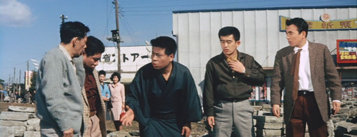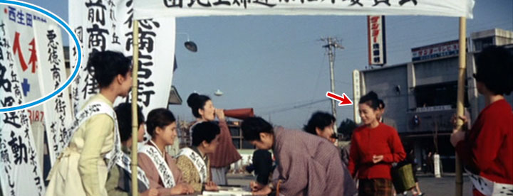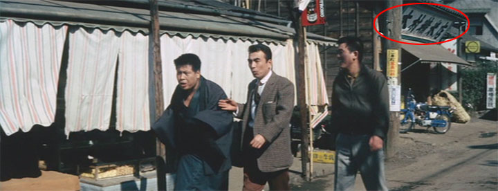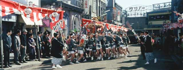 ![]() この撮影地が不明だった頃、ここはもしかしたらオープンセットなのではないか、と疑ったことがあった。 オープンセットというより撮影所の敷地内。まず喧嘩をしている空地はその時使用されていなかった撮影所内。セット製作の材料、あるいは廃材が散乱している。「用賀新東宝」の建物はスタジオの外壁に看板などを取り付け、それらしく見せている。看板はリアルに汚され、「用賀新東宝」の「宝」の文字は切り抜き文字がとれてしまっているなど芸が細かい。「大衆食堂」の看板は屋号も書かれておらず、いかにも架空。「用賀ストアー」は白地に黒ペンキのごく簡単なデザイン。ここはあまり手をかけなかったようだ。 本気でそれも有り得ると推測していた。何故ここを用賀に見せたかったのかは理由がわからなかったが。 ↓ ちなみにこの作品に下に示したようなシーンがある。お祭りのお神輿が商店街を練り歩くシーン。これ実はオープンセット。とてもよく出来ている。ここまでセットにこだわるのなら、用賀のシーンもオープンセット? と考えても無理もない。と言い訳したい。 |