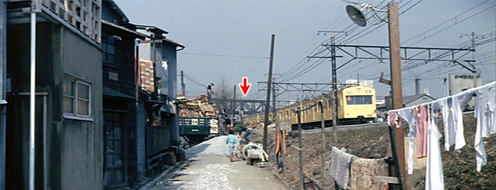 ああ、なんという素晴らしいセリフだろう。さて、仲間はさらに増え、クレージーの7人プラス紅一点、中山(中尾ミエ)の8人になり、上田が社長、「よろずまとめ屋」は会社組織になり、事務所を構える。ところが仕事はなかなか舞い込まない。「しかし社長、人間、メシ食わなかったら生きていかれませんよ」 「またそういうありふれたことを言う、君ねえ、メシなんてのは生まれてからずーっと食ってるんだよ、もう飽きてもいいよ」 黄色い電車が走っている。この線路脇に事務所がある。黄色い電車は総武線ではなく山手線だ。黄色だった山手線の車両はこの作品公開の1963年から順次、そのままの色で総武線に転属にななり、山手線はグリーンの新型車両に入れ替わっていく。しかしこの場面ではまだこの黄色い山手線が写っている。方向幕には「山手」と表示されている。 遠景に鉄橋が交差しているのが見える。 |