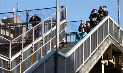 このシーンの巡礼に出かけたのは東横線が地下化させるのが間近い快晴の日曜日。東横線の渋谷駅をはじめ、いたるところでカメラを持った鉄道ファンの方を見かけた。 この写真は山手線と東横線が交差する件の鉄橋から、すぐ近くのところにある山手線をまたぐ歩道橋。この写真を撮った時、ちょうど山手、東横、両線の電車が同時に交差して通過していた。その瞬間を撮影する鈴なりの鉄道ファン。 (撮影・2013・02・24) |