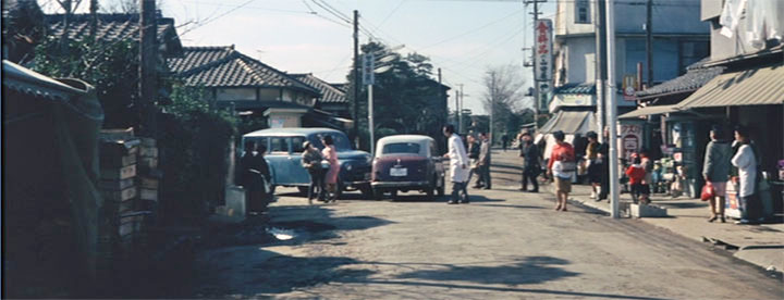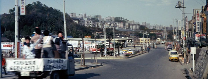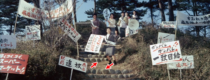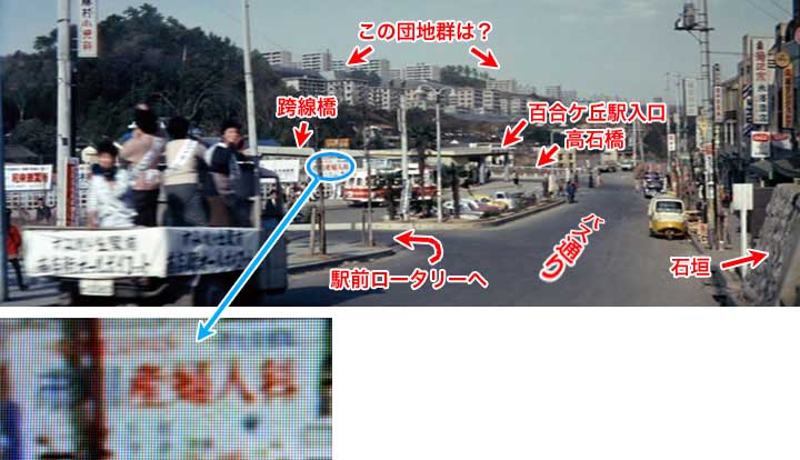 ![]() ![]() (撮影・2013・02・03) さすがに商店街ボイコットという場面なので、特定の本物の商店街を実名で登場させるわけにはいかなかったのだろう。百合丘とは言わず「すみれケ丘」と言っている。 しかしこの後の展開からしても、画面に写っている細部を見ても、ここは小田急線の百合ケ丘駅前で間違いない。 細部というのは以下のような点だ。たとえば。 ↓ 下図で画面に説明を入れてみた。 ![]() ↑ 車に乗った団地マダム達が、やや下り坂と思える道路を向こうに向かって走っている。 行く先左側に見えるのは手前から順に、百合ケ丘駅の二本のホームをつなぐ跨線橋の上部(百合ケ丘駅は切り通しになっているので跨線橋は上部しか見えない)、百合ケ丘駅入口、線路をまたいで南北を結ぶ陸橋(高石橋)が写っている。 走って行く車のすぐ先左側には駅前ロータリーに入る入口が見え、道路をはさんで反対側には石垣が写っている。現在写真でも同様にロータリー入口があり、分かりずらいが石垣が現在もある。 間違いなくここは百合ケ丘駅南口のバス通りだ。百合ケ丘駅の南側から線路越しに百合ケ丘駅の北側方向を見ている。間違いない。 (青矢印の「市川産婦人科」については次のシーンで。) しかし画面の中で注目してもらいたいのが、線路の向こう側、百合ケ丘駅の北側方向の高台斜面にに団地建物が連なっているの様子。 完成して間もない百合丘団地? (百合丘団地は1960年から順次完成) いやいや、百合丘団地はこんな方向には無い。百合丘団地はここから見える百合ケ丘駅の北側でなく、逆の南側だ。(「東宝映画のロケ地を訪ねる・「喜劇 駅前団地」参照) 映画公開翌年の1964年に撮影された航空写真で確認してみた。百合ケ丘駅の北側方面の高台には木造家屋と思われる建物が点在しているだけで、とてもこのような巨大な団地群は存在しない。現在ではけっこう大きいマンションも出来ているが。 では確かに画面に見えるこの団地群はいったい何? わからない。そんなはずはない。どういうことなんだ。 結論。「合成画面」としか考えられない。百合ケ丘駅前の商店街を車で走るボイコット運動婦人たち。背景には団地。この構図が必要だったのだろう。 それにしてもこの合成画面、あまりによく出来ているので驚く。 撮影地ストリートビュー |