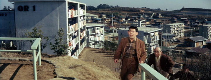 ![]() ![]() (撮影・2013・02・03) ↑ ボイコット運動の会合が代表宅で開かれているとの情報で、会長宅に向かう商店街の会長と上田ら「よろずまとめ屋」たち。 ここはどこなのか。会長たちは階段を上がっている。背景に見える団地を見下ろす高台のようだ。画面の左端に弘法松公園が見える。 ↓ 弘法松公園以外に何か手がかりはないだろうか。 上の場面の数秒手前は下のような場面だ。 あった、あった。団地の棟の一つに「105」と書いてあるのが見える。105号棟がここに見えるのか。 ![]() ↓ ここで「東宝映画のロケ地を訪ねる・喜劇 駅前団地」では大変お世話になった「1960年代の百合小と百合丘」のSさんが製作された団地地図をお借りして考えてみた。百合丘団地が取り壊しになる以前の様子を表したものだ。 下図はその団地地図の一部を切り出し、書き入れたもの。 105号棟を見下ろす地点で弘法松公園がやや左方向に見える。撮影地点はこのあたりか。 すると撮影地点からすぐ下に見える、他の団地建物とは少し違った広い屋上の建物は団地の集会所だったということが分かる。その右にスターハウス(Y字型の団地建物)の109号棟が見える。 間違い無し。撮影地点は百合丘第二団地122号棟付近だ。